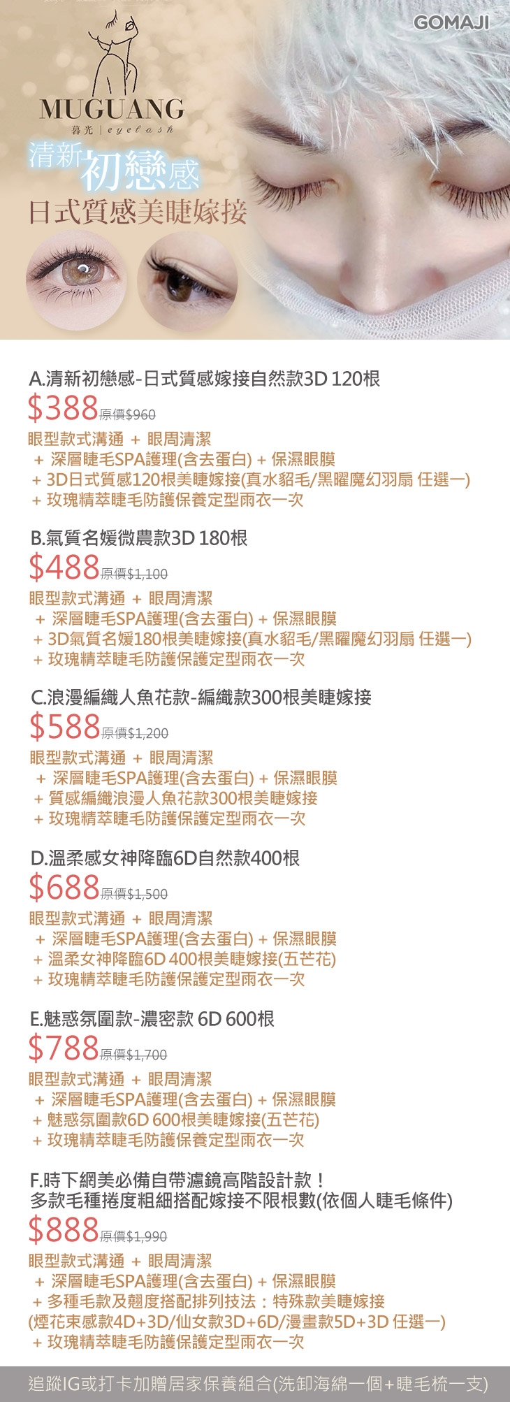 A.清新初戀感-日式質感嫁接自然款3D 120根 / B.氣質名媛微農款3D 180根 / C.浪漫編織人魚花款-編織款300根美睫嫁接 / D.溫柔感女神降臨6D自然款400根 / E.魅惑氛圍款-濃密款 6D 600根 / F.時下網美必備自帶濾鏡高階設計款!多款毛種捲度粗細搭配嫁接不限根數(依個人睫毛條件)