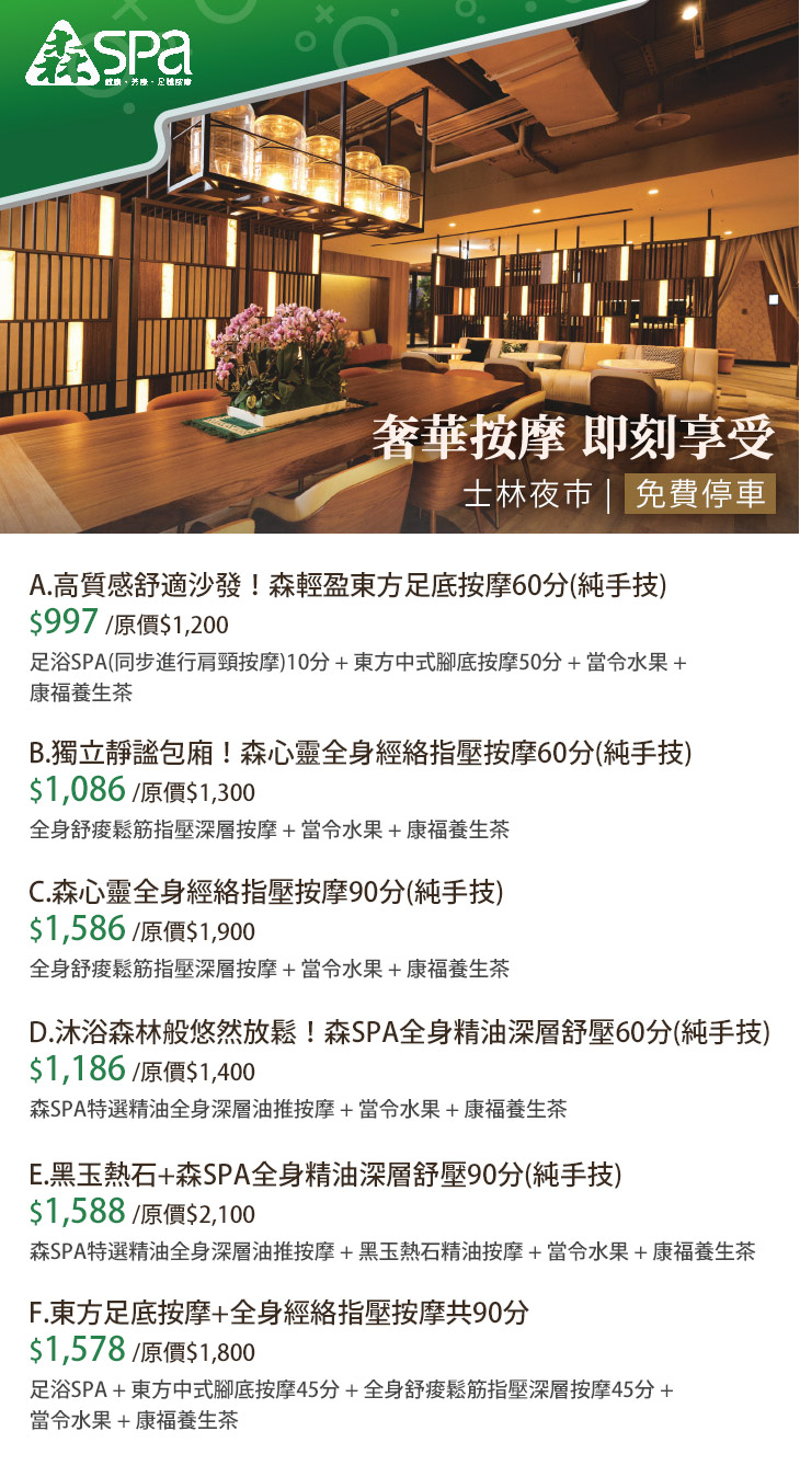 A.高質感舒適沙發!森輕盈東方足底按摩60分(純手技) / B.獨立靜謐包廂!森心靈全身經絡指壓按摩60分(純手技) / C.森心靈全身經絡指壓按摩90分(純手技) / D.沐浴森林般悠然放鬆!森SPA全身精油深層舒壓60分(純手技) / E.黑玉熱石+森SPA全身精油深層舒壓90分(純手技) / F.東方足底按摩+全身經絡指壓按摩共90分