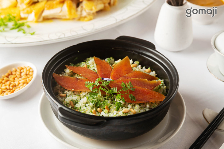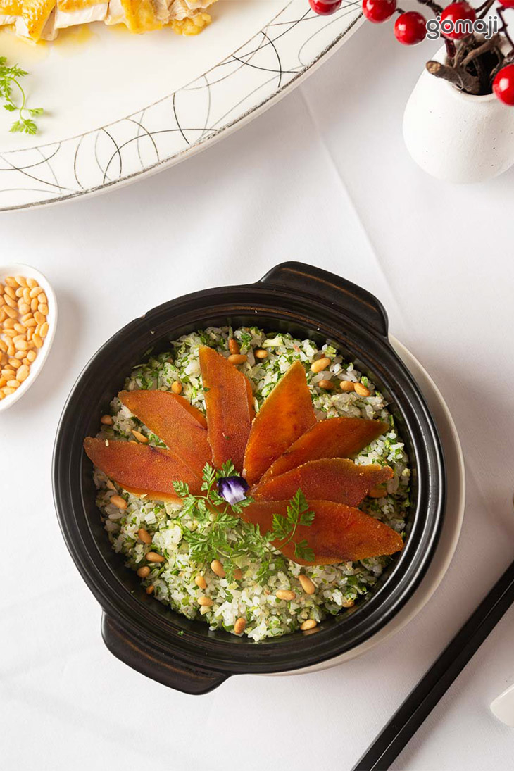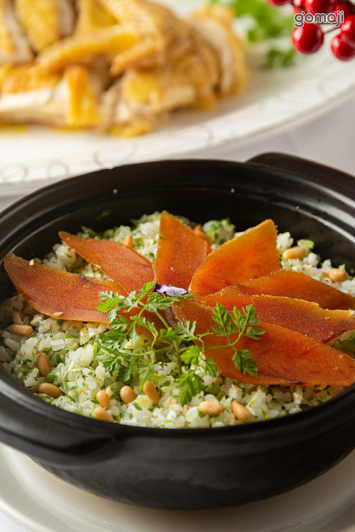 國宴級名菜「雞汁菊花豆腐」以滑嫩的芙蓉豆腐為主角,菊花豆腐是一道色香味俱全的漢族傳統名菜。主廚以精湛沉穩的刀工,切成菊花狀的豆腐絲,加入以老母雞與番鴨一同熬煮8小時而成的雞精,入口湯頭濃郁、豆腐清香,打造極具視覺與味覺佳餚。
