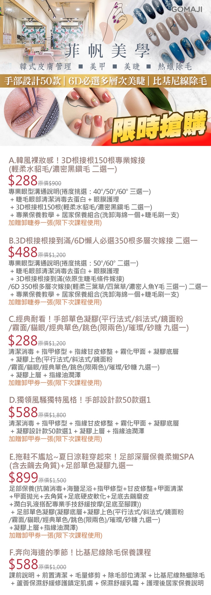 A.韓風裸妝感!3D根接根150根專業嫁接(輕柔水貂毛/濃密黑鑽毛 二選一) / B.3D根接根接到滿/6D懶人必選350根多層次嫁接 二選一 / C.經典耐看!手部單色凝膠(平行法式/斜法式/鏡面粉/霧面/貓眼/經典單色/跳色(限兩色)/璀璨/砂糖 九選一) / D.獨領風騷獨特風格!手部設計款50款選1 / E.拖鞋不尷尬~夏日涼鞋穿起來!足部深層保養柔嫩SPA(含去繭去角質)+足部單色凝膠九選一 / F.奔向海邊的季節!比基尼線除毛保養課程