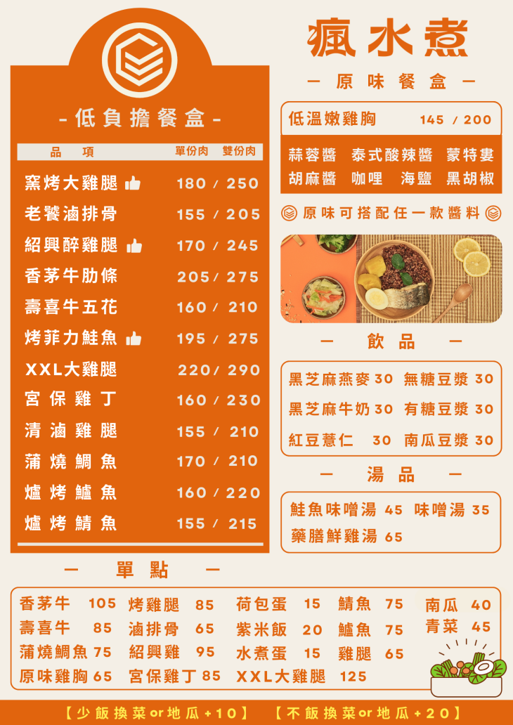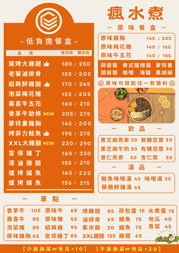 瘋水煮是一家主打健康概念的便當專賣店,以清爽調味與均衡搭配為核心,讓外食也能吃得安心無負擔。餐點強調原味呈現,不走厚重路線,吃起來清新順口卻不失風味層次。主菜口感處理得恰到好處,搭配多樣配菜,整體營養與份量都兼顧。無論是上班族午餐、健身飲控族,或想吃得清爽一點的時候,都很適合來上一份。瘋水煮把「健康」變得不無聊,讓每天的便當也能吃得有質感又有飽足感。