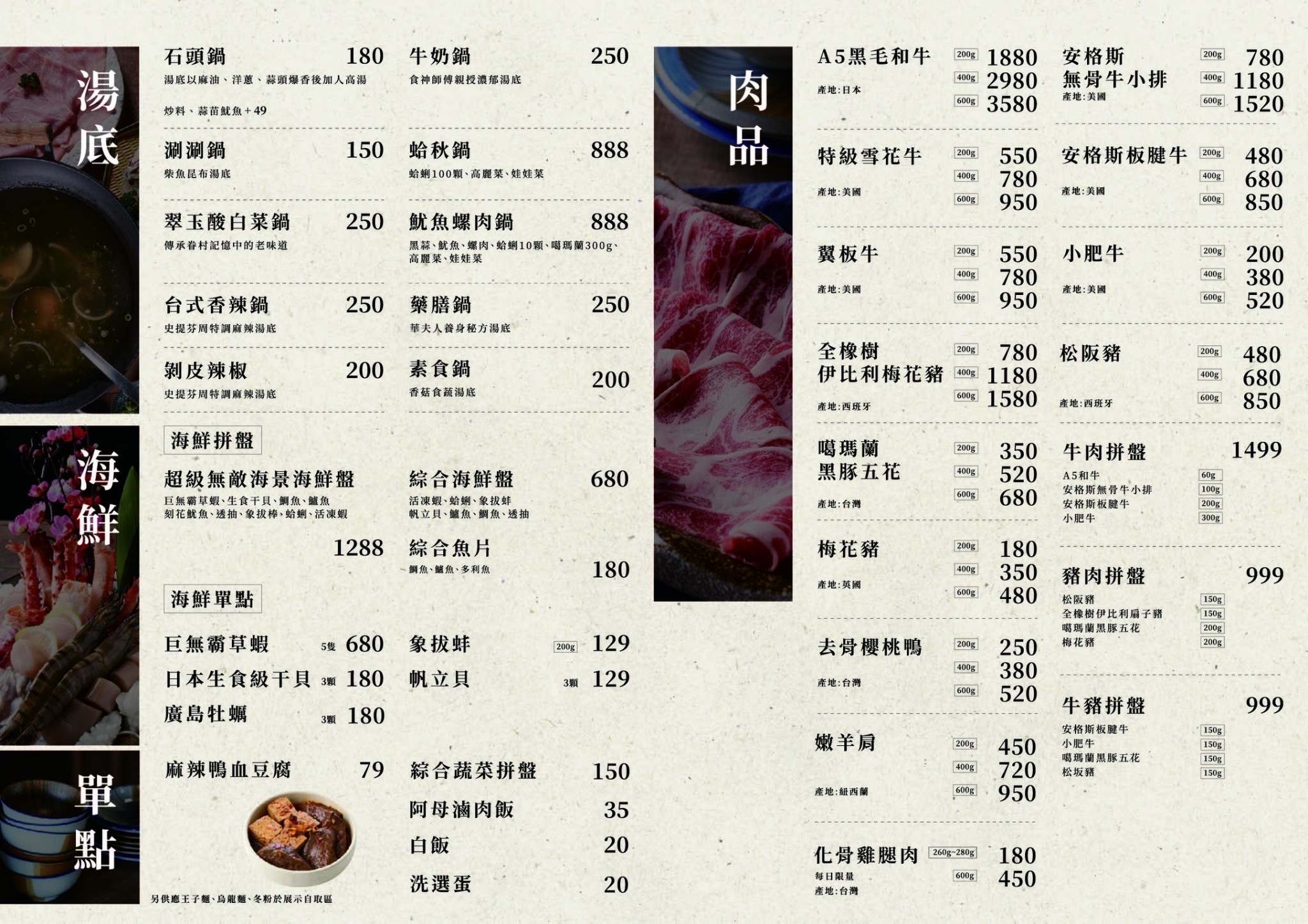 吃火鍋怎麼可以少了絕美海鮮!拼盤中充滿了豐富多樣的海鮮美味,包括新鮮的鮮蝦、粒粒飽滿的蛤蜊、鮮美的魚片以及Q彈的貝類等等食材,每一口都帶來迷人的海洋風味。經過火鍋的烹煮使得海鮮保持了其鮮度和口感,讓您可以享受到海鮮的最佳滋味。