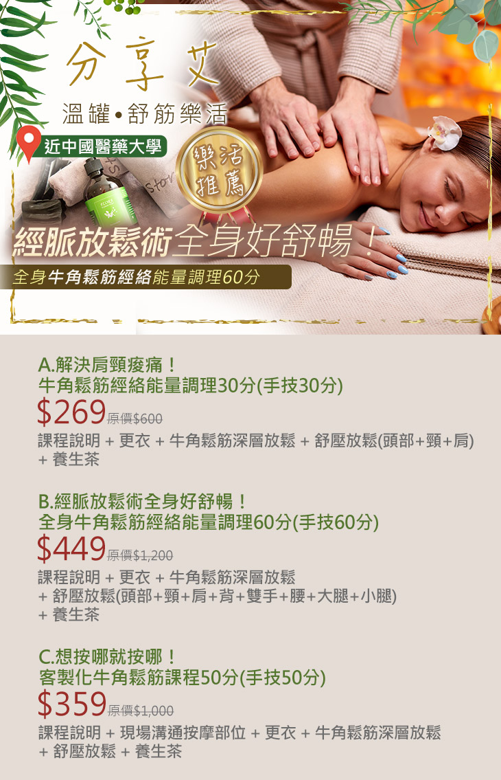 A.解決肩頸痠痛!牛角鬆筋經絡能量調理30分(手技30分) / B.經脈放鬆術全身好舒暢!全身牛角鬆筋經絡能量調理60分(手技60分) / C.想按哪就按哪!客製化牛角鬆筋課程50分(手技50分)