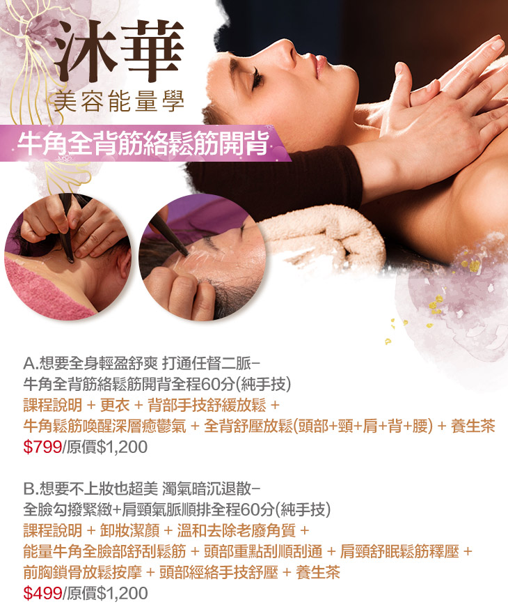 A.想要全身輕盈舒爽 打通任督二脈-牛角全背筋絡鬆筋開背全程60分(純手技) / B.想要不上妝也超美 濁氣暗沉退散-全臉勾撥緊緻+肩頸氣脈順排全程60分(純手技)