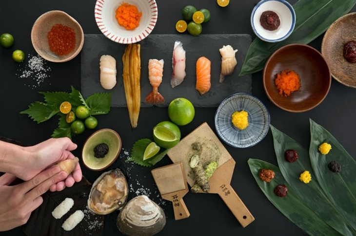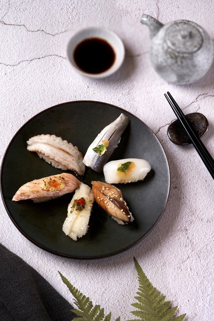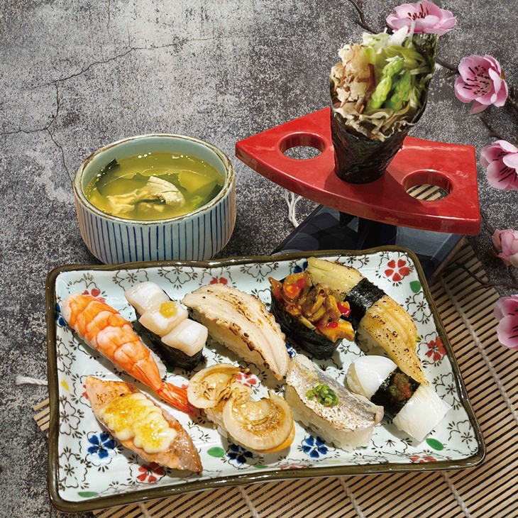 這組炙燒壽司散發著誘人的香氣,每一貫都像是火焰與海味的完美結合。焦糖鮭魚的甜香、炙竹筴魚的油潤,再加上照燒帆立貝與燻烤章魚的多層風味,整體豐富又不膩口。軍艦系列的韓風螺片與柚香小貝柱,增添微酸與脆爽的驚喜感。最後以清爽的蘆筍手捲收尾,一口咬下盡是清新與滿足。