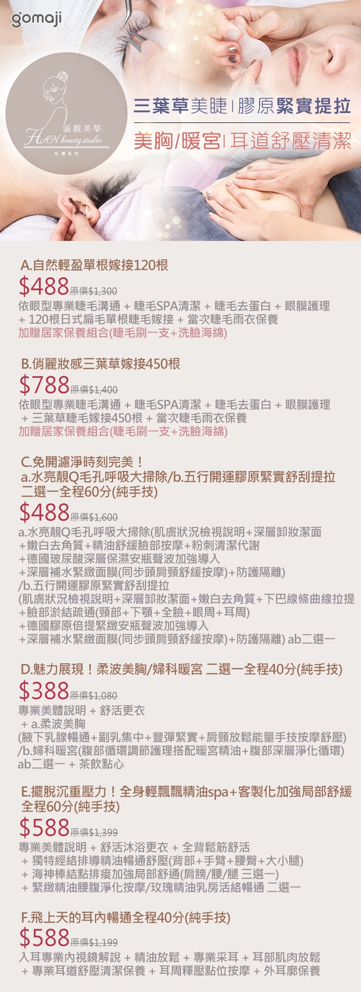 A.自然輕盈單根嫁接120根 / B.俏麗妝感三葉草嫁接450根 / C.免開濾淨時刻完美!a.水亮靚Q毛孔呼吸大掃除/b.五行開運膠原緊實舒刮提拉 二選一全程60分(純手技) / D.魅力展現!柔波美胸/婦科暖宮 二選一全程40分(純手技) / E.擺脫沉重壓力!全身輕飄飄精油spa+客製化加強局部舒緩全程60分(純手技) / F.飛上天的耳內暢通全程40分(純手技)