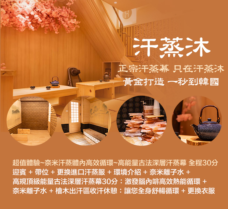 〈迎賓 + 帶位 + 更換進口汗蒸服 + 環境介紹 + 奈米離子水 + 高規頂級能量古法深層汗蒸幕30分:激發腦內啡高效熱能循環 + 奈米離子水 + 檜木出汗區收汗休憩:讓您全身舒暢循環 + 更換衣服〉