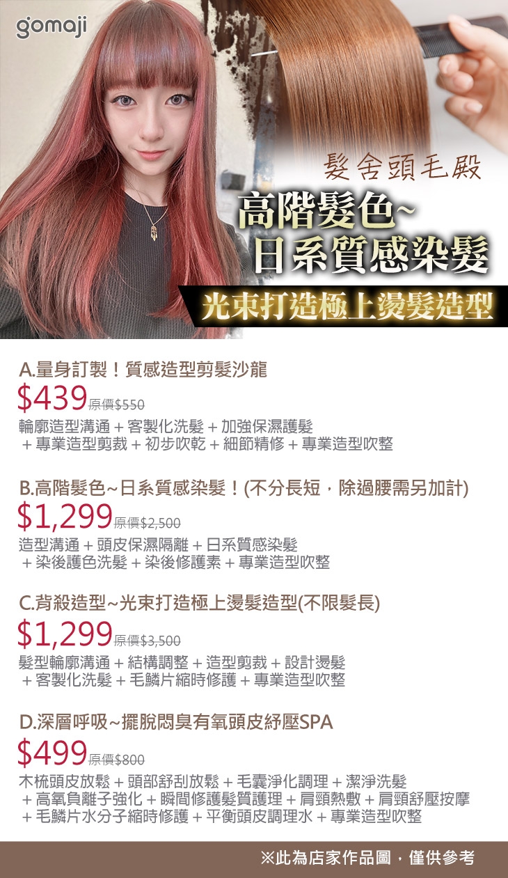 A.量身訂製!質感造型剪髮沙龍 / B.高階髮色~日系質感染髮!(不分長短,除過腰需另加計) / C.背殺造型~光束打造極上燙髮造型(不限髮長) / D.深層呼吸~擺脫悶臭有氧頭皮紓壓SPA