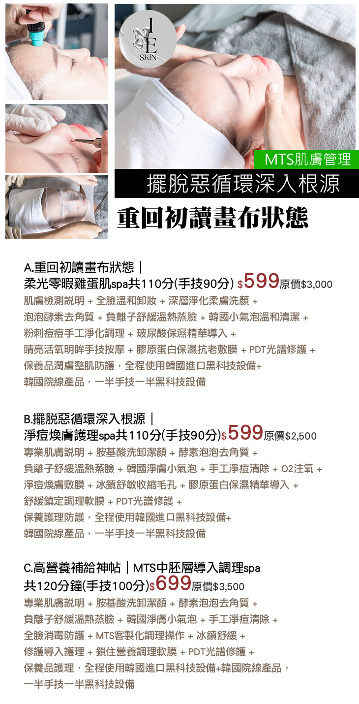 A.重回初讀畫布狀態|柔光零暇雞蛋肌spa共110分(手技90分) / B.擺脫惡循環深入根源|淨痘煥膚護理spa共110分(手技90分) / C.高營養補給神帖|MTS中胚層導入調理spa共120分鐘(手技100分)