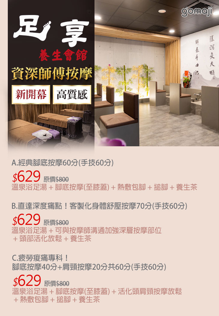 A.經典腳底按摩60分(手技60分) / B.直達深度痛點!客製化身體舒壓按摩70分(手技60分) / C.疲勞痠痛專科!腳底按摩40分+肩頸按摩20分共60分(手技60分)