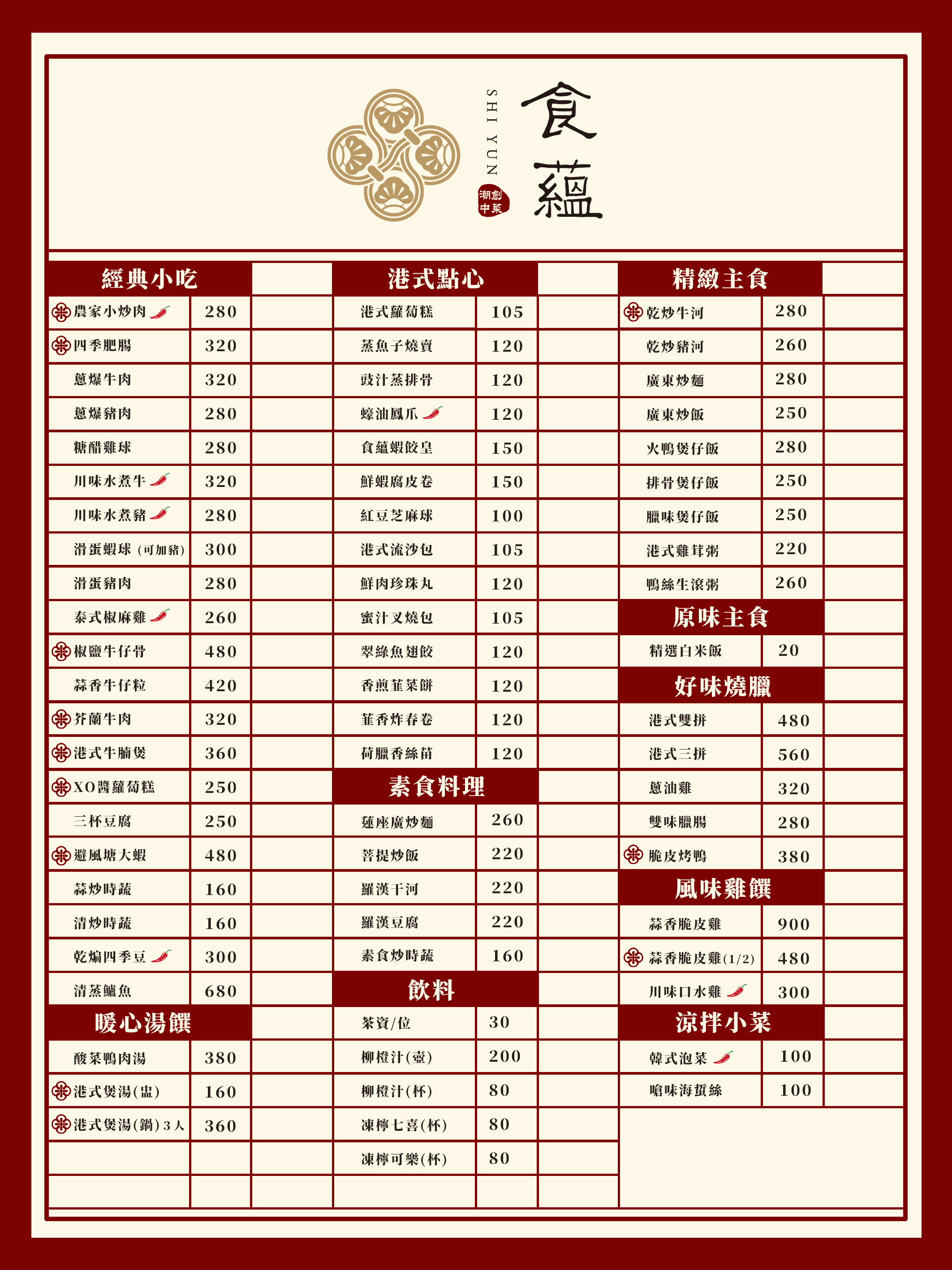 融合廣東菜的鍋氣、川菜的麻香與台菜的人情味,食蘊打造出獨具風格的創新中菜。招牌菜包含鍋氣十足的干炒牛河、蛋香四溢的廣東炒飯,以及脆彈鮮香的XO醬爆炒蝦球,每一道都深受饕客喜愛。