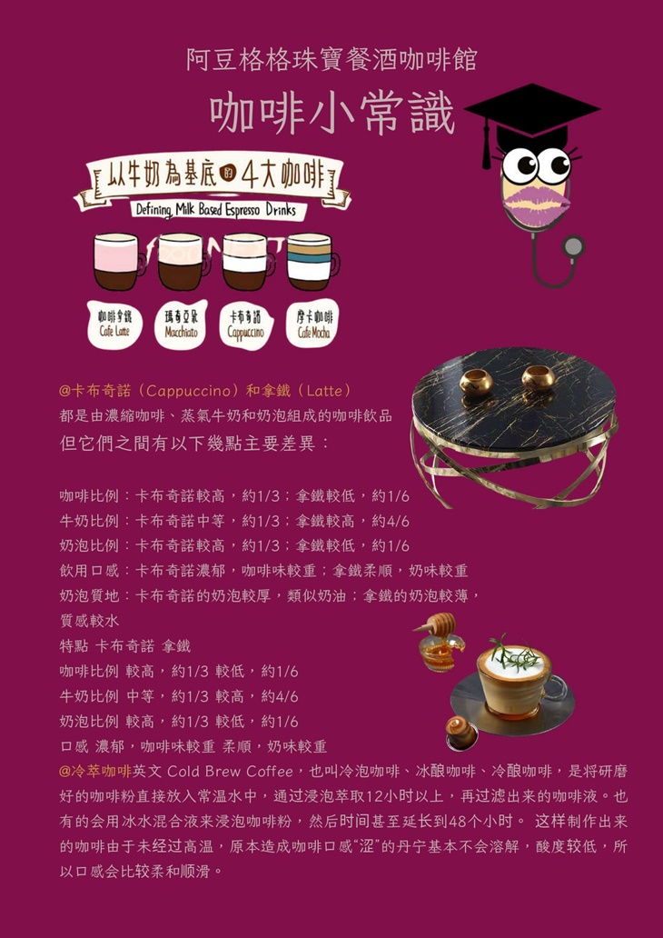 阿豆格格餐酒咖啡館是一家複合式餐廳,融合了餐酒館、咖啡廳的特色,為顧客提供全方位的感官享受。店內裝潢精緻簡約,非常適合與親友共度美好時光。餐點方面,阿豆格格注重精緻與創意,主打多元的料理,無論是美味的主菜還是精緻的甜點,都讓人驚豔不已。咖啡與下午茶選項也備受歡迎,尤其是手工甜點與飲品的搭配,更是令人回味無窮。