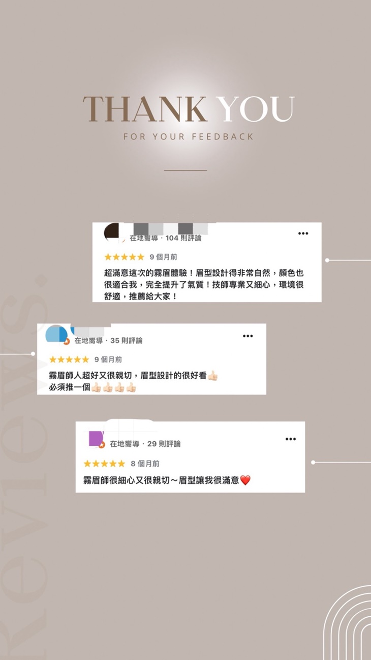〈專屬眉型設計溝通 + 客製化眉型繪製 + 眉部肌膚消毒清潔 + 鎮定舒緩處理 + 半永久霧眉上色定型 + 舒緩修護保養 + 居家保養指導〉