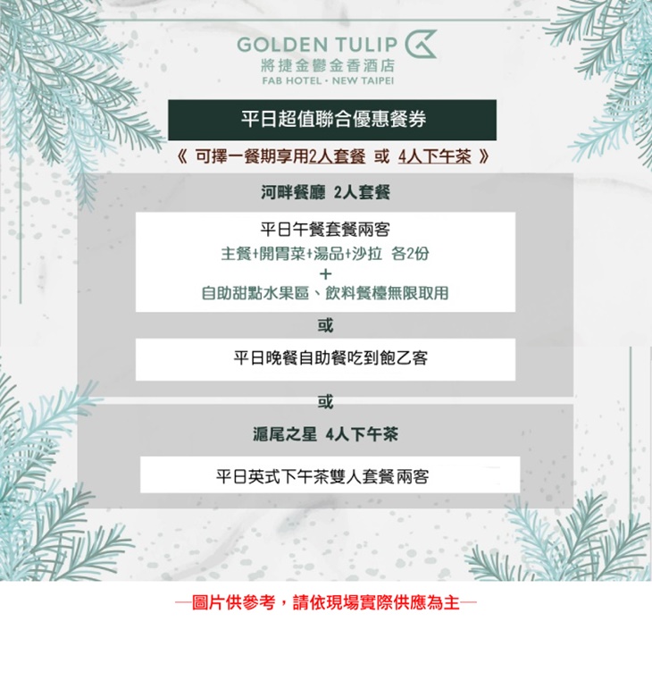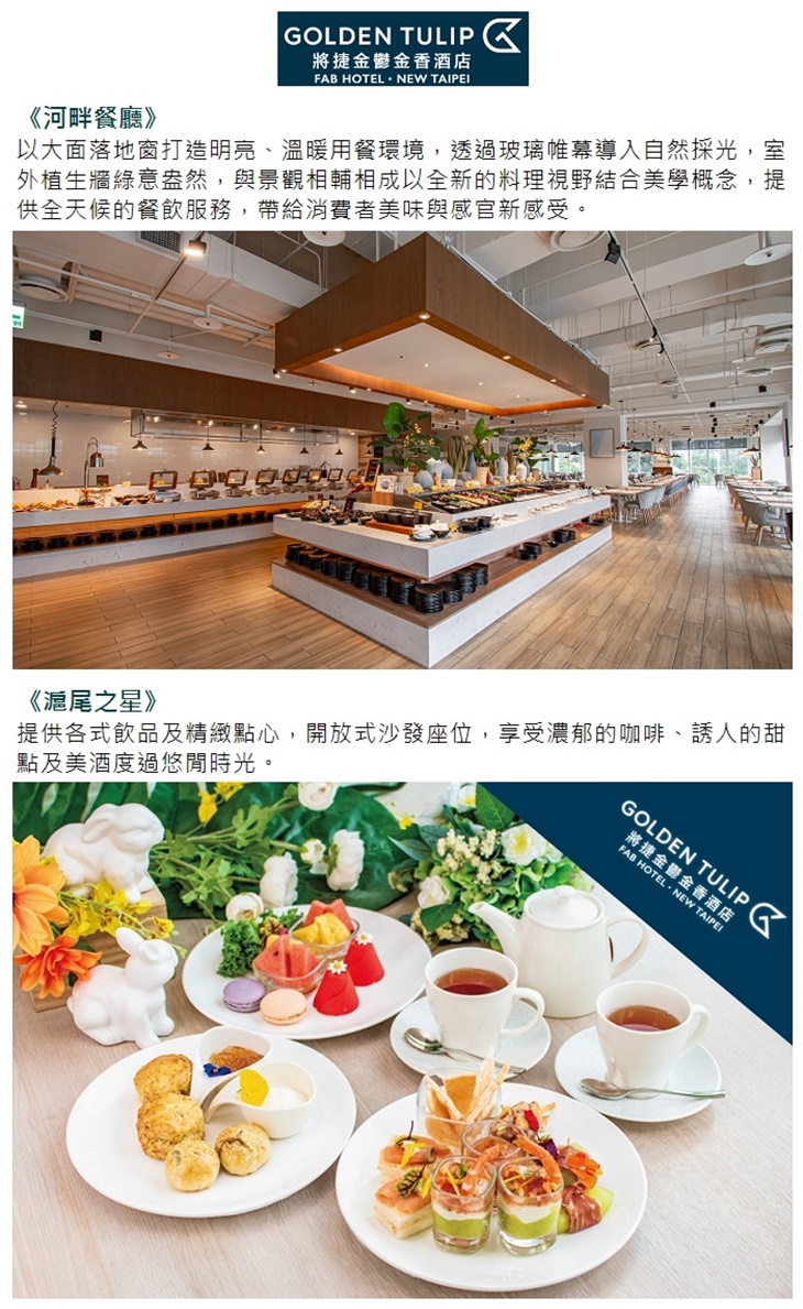 每張只要2100元,即可享有【將捷金鬱金香酒店-河畔餐廳/滬尾之星】平日超值聯合優惠餐券二張