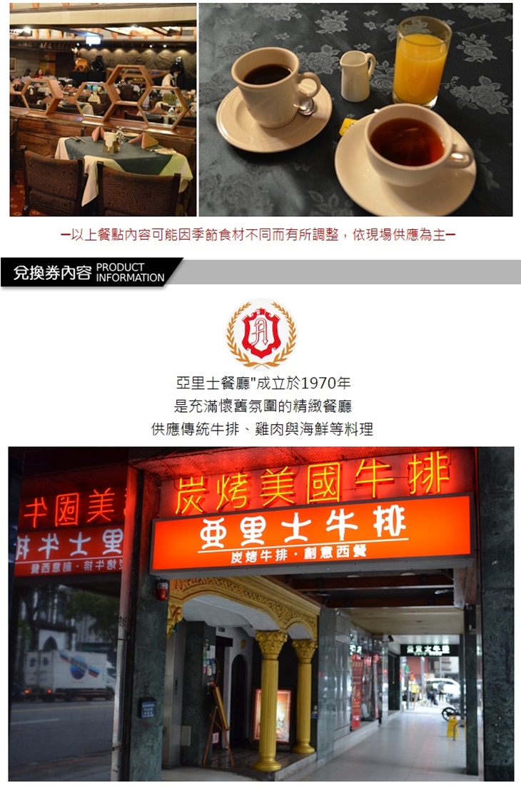 只要1380元,即可享有【亞里士餐廳】平日晚間限定單人豪華套餐