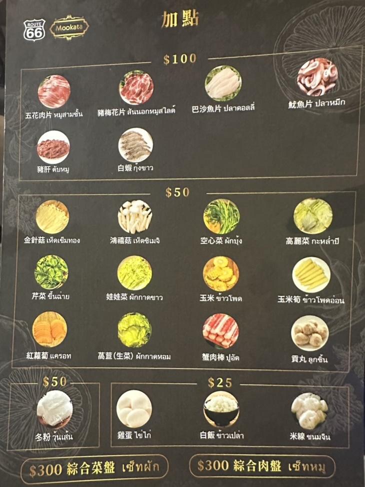Route66 Mookata 泰式燒烤 (หมูกระทะ) 是一間主打「泰式銅盤烤肉火鍋」的特色餐廳,讓人一次滿足對肉香與湯頭的渴望。店內氛圍熱鬧又有濃厚異國風情,適合朋友聚會或家庭聚餐。銅盤中央可以燒烤各式醃漬入味的肉品,四周圍則是香氣濃郁的湯鍋,能燙煮蔬菜、海鮮與冬粉,享受一鍋多吃的樂趣。
