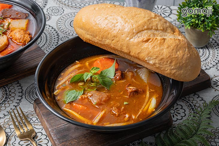 是深受歡迎的越式經典料理,融合了法式飲食文化與越南口味,這道料理的靈魂是紅燒牛肉,選用帶筋帶油花的牛肉塊,搭配多種香料,使湯頭濃郁醇厚、肉質酥軟入味。湯中帶有微微甜香與香料的層次感,入口溫潤不膩,與之搭配的是越式法國麵包,外酥內軟、蓬鬆有嚼勁。將熱騰騰的牛肉與湯汁夾進麵包中一同享用,既能吸附湯汁的精華,又增添了豐富口感。無論單吃牛肉,還是沾著麵包品嘗,都讓人一口接一口、回味無窮。