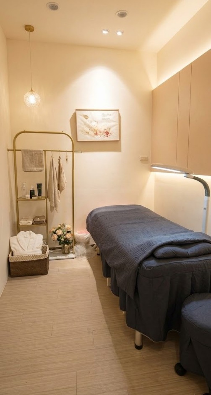 〈花茶迎賓 + 膚況客製化分析與養護說明 + 掌壓背部律動舒緩 + 肩頸沉重釋放 + 背部、腰部精油順暢細緻按摩 + 微米級溫柔卸妝與潔淨 + 細緻去角質絲滑觸感 + 水光導入 + 深層凝水保濕面膜 + 整肌防護 + 全方位物理防曬 + 課後養生茶飲與美學紀錄〉