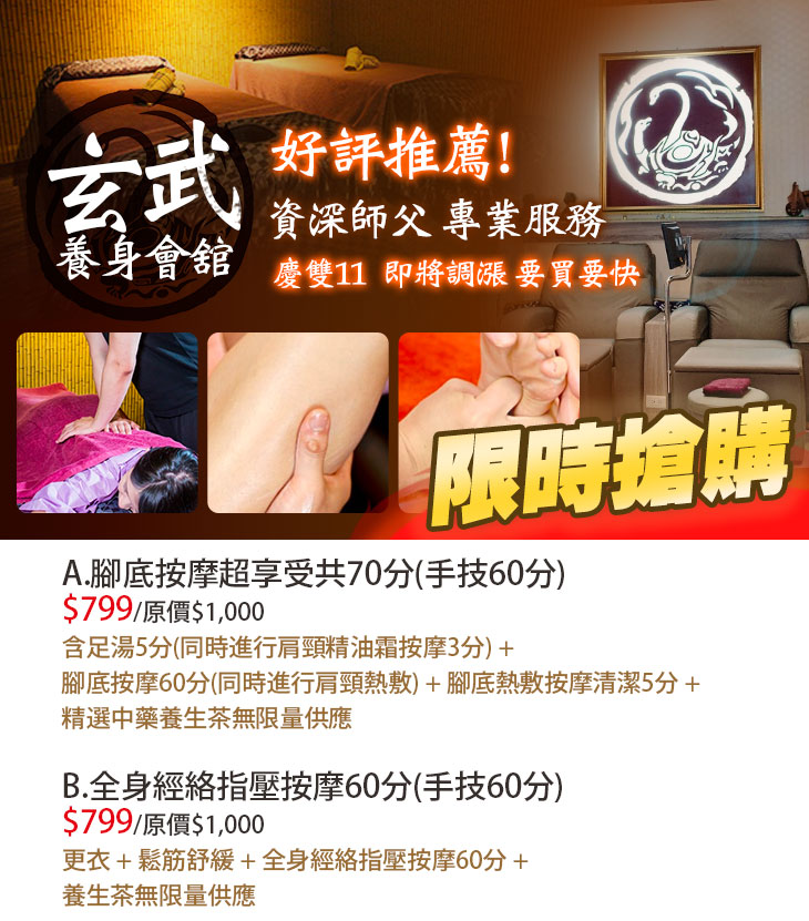 口碑推薦、好評不斷~專業勁道的按摩手技,絕對讓您整身又酥又放鬆,逃離平日上班的苦悶,按完後整個人煥然一新,重拾柔軟的身段、輕盈的步伐!整潔的環境、寬敞的空間,加上師傅們親切如故的態度,致力於給予每一位到訪的客人賓至如歸的豪華享受,快來【玄武養身會舘】體驗飄飄然的舒適感受吧!
