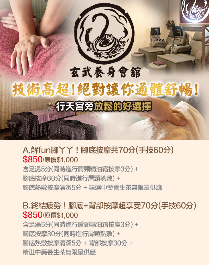 用心打造靜謐、典雅的空間,讓您有個能恣意放鬆身心的小天地!舒服的按摩手法絕對讓您整身又酥又放鬆,逃離平日上班的苦悶,不論是按摩師的精湛手技、親切態度,還是環境的舒適氛圍,都讓人好滿意!快來【玄武養身會舘】體驗看看~感受漫步於雲端的飄然自在吧!