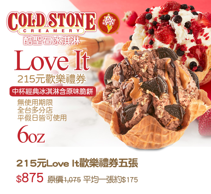 215元Love It歡樂禮券(可兌換中杯經典冰淇淋含原味脆餅乙份容量6oz(無使用期限/全台多分店/平假日皆可使用/可外帶)