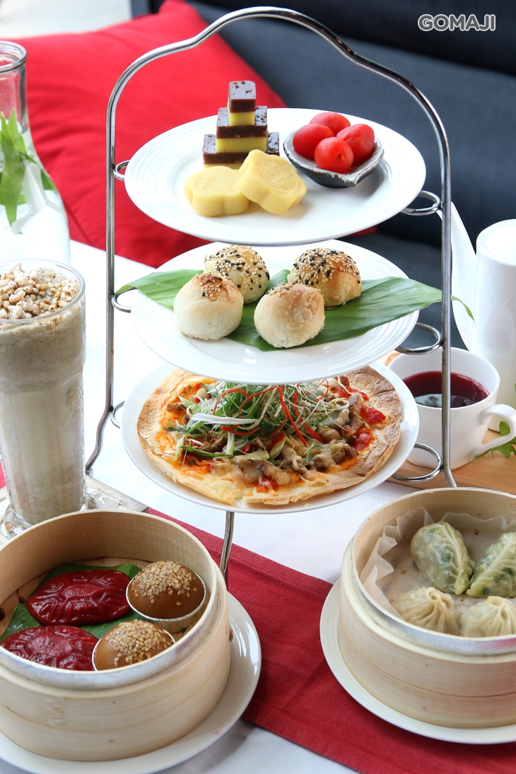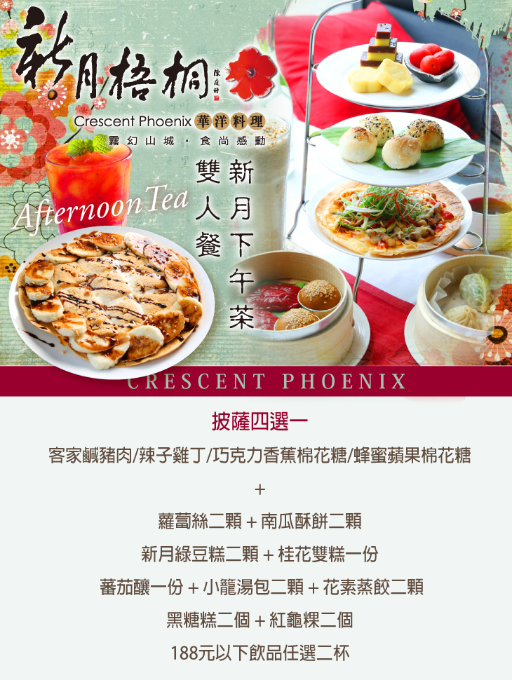 〈披薩:客家鹹豬肉/辣子雞丁/巧克力香蕉棉花糖/蜂蜜蘋果棉花糖 四選一 + 蘿蔔絲二顆 + 南瓜酥餅二顆 + 新月綠豆糕二顆 + 桂花雙糕一份 + 蕃茄釀一份 + 小籠湯包二顆 + 花素蒸餃二顆 + 黑糖糕二個 + 紅龜粿二個 + 188元以下飲品任選二杯〉