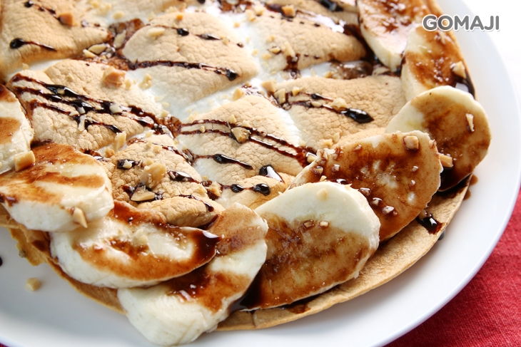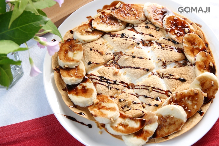 為了製作出完美的披薩口感,每一道程序皆嚴謹,剛出爐的披薩香氣四溢,外皮酥香內裡細緻Q彈,牽絲的瞬間透著餅皮的淡雅香氣,在餅皮上頭放滿新鮮香蕉及棉花糖,再淋上香濃巧克力醬,香香甜甜的氣息,可口迷人、層次豐富,絕妙搭配瞬間征服眾人的心!