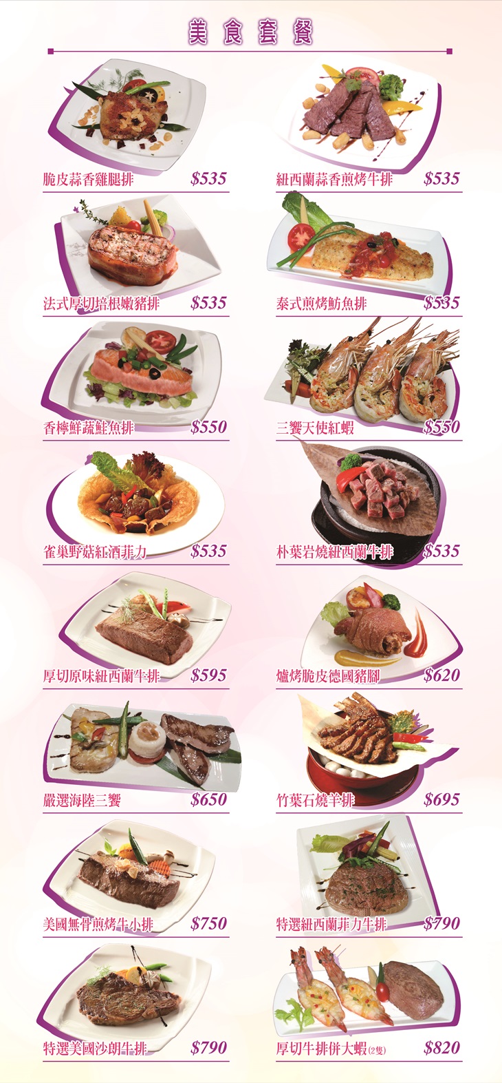 特別推薦:爐烤脆皮德國豬腳、厚切原味紐西蘭牛排、朴葉岩燒紐西蘭牛排、香檸鮮蔬鮭魚排等