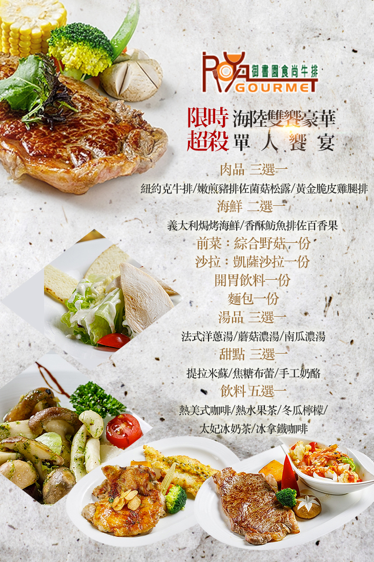 限時超殺5折!全新升級!海陸雙饗豪華九品饗宴,不到400元,就是要給您最物超所值的體驗!熱銷強檔,要搶要快,再晚就沒有啦!【御書園食尚牛排餐廳】成立於民國75年,至今已經營30多年,回顧當時圖書咖啡成為一股風潮,掀起讀書咖啡文化,而隨著時代更迭及餐飲文化改變,御書園已於95年轉型為御書園食尚牛排,不變的依舊是精緻的飲食和優質的用餐環境和服務,現在誠摯的邀請您闔家光臨!