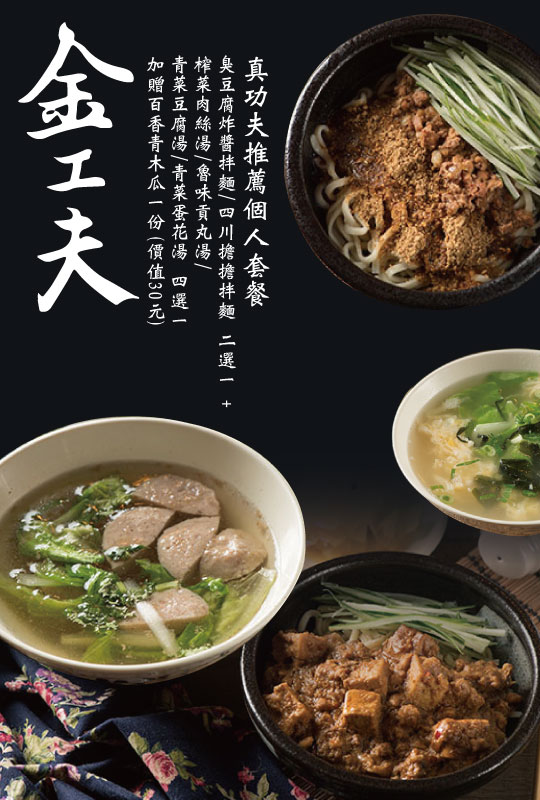金工夫(吉林店) 輕推開門,走入木質空間,柔和燈光將店內照映至溫馨無比,幸福的氛圍驅散您生活的煩憂與壓力,在這裡細細品味特製料理,輕啜一口飲品,沉澱心靈! 真功夫推薦個人套餐 臭豆腐炸醬拌麵/四川擔擔拌麵 二選一 + 榨菜肉絲湯/魯味貢丸湯/青菜豆腐湯/青菜蛋花湯 四選一,加贈百香青木瓜一份(價值30元) 臭豆腐炸醬拌麵 四川擔擔拌麵 魯味貢丸湯 青菜蛋花湯 青菜豆腐湯 加贈百香青木瓜