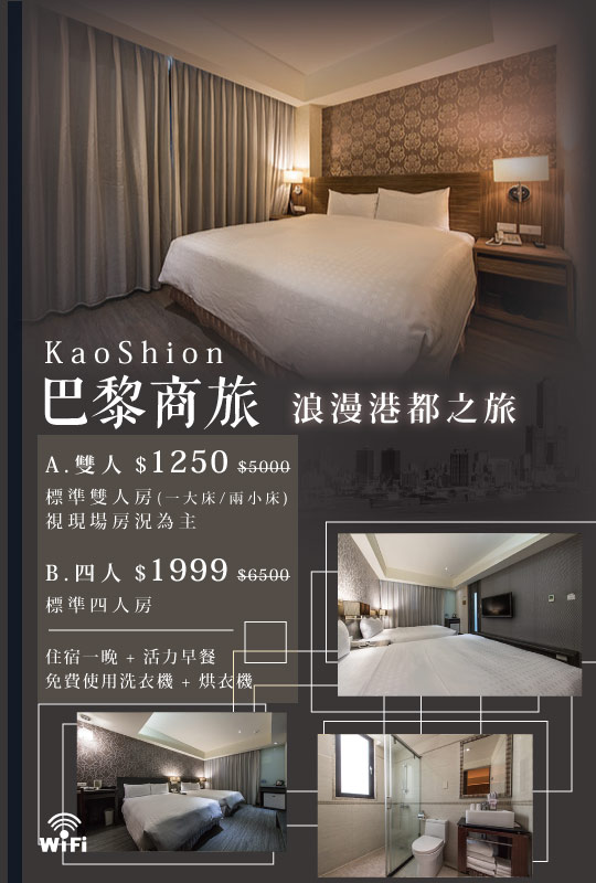【巴黎商旅】位於高雄市新興區市區中心,自立路及大同路交叉口,旅客可徒步前往六合國際觀光夜市、南華新興夜市、中央公園R9捷運站、美麗島R10捷運僅需步行五分鐘路程即可到達,也可散步新崛江商場以及城市光廊,再前往及大立百貨逛街購物,沿途可再徒步走至漢神百貨以及光榮碼頭、真愛碼頭觀賞愛河及海岸景色;午後可搭車到鼓山渡船頭搭船賞港區夜景,旗津品嚐海鮮或者也可至西子灣壽山公園英國領事館及忠烈祠俯瞰高雄市黃昏街景及夜景。