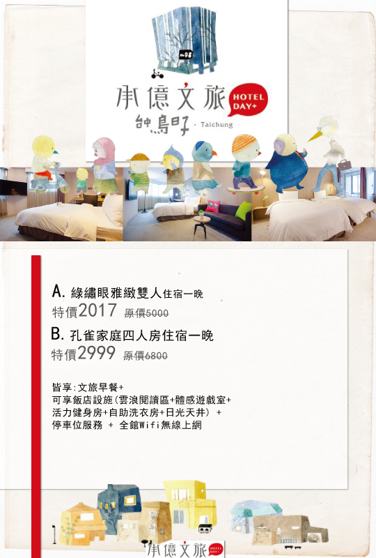 忙碌的生活需要一些微小但確切的幸福,才有力量。也許是享受一頓美食、一場輕旅漫遊, 旅宿一間設計旅店…【承億文旅系列-台中鳥日子】,奇特的名字,創造平淡出奇的樂趣,鳥日子快樂遊,快樂鳥日子,也許,生活不必如詩,只需一些簡簡單單的小幸福,已然滿足。