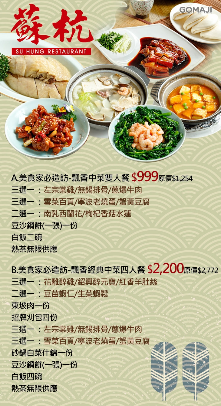 蘇杭餐廳成立於1984年,以經營江浙菜及上海點心為主,遵循古法,講究傳統,研發新味,呈現創意,帶給您驚豔的新上海美食!在眾多媒體與網路部落客的推薦下,以「真材實料、價格公道」累積了知名度。先後在台北區域開設門店,蘇杭持續在料理研發上努力,累積在江浙料理的經驗,期許成為台灣新上海菜的代表,未來將持續把美味的料理帶給更多喜歡美食的消費者。