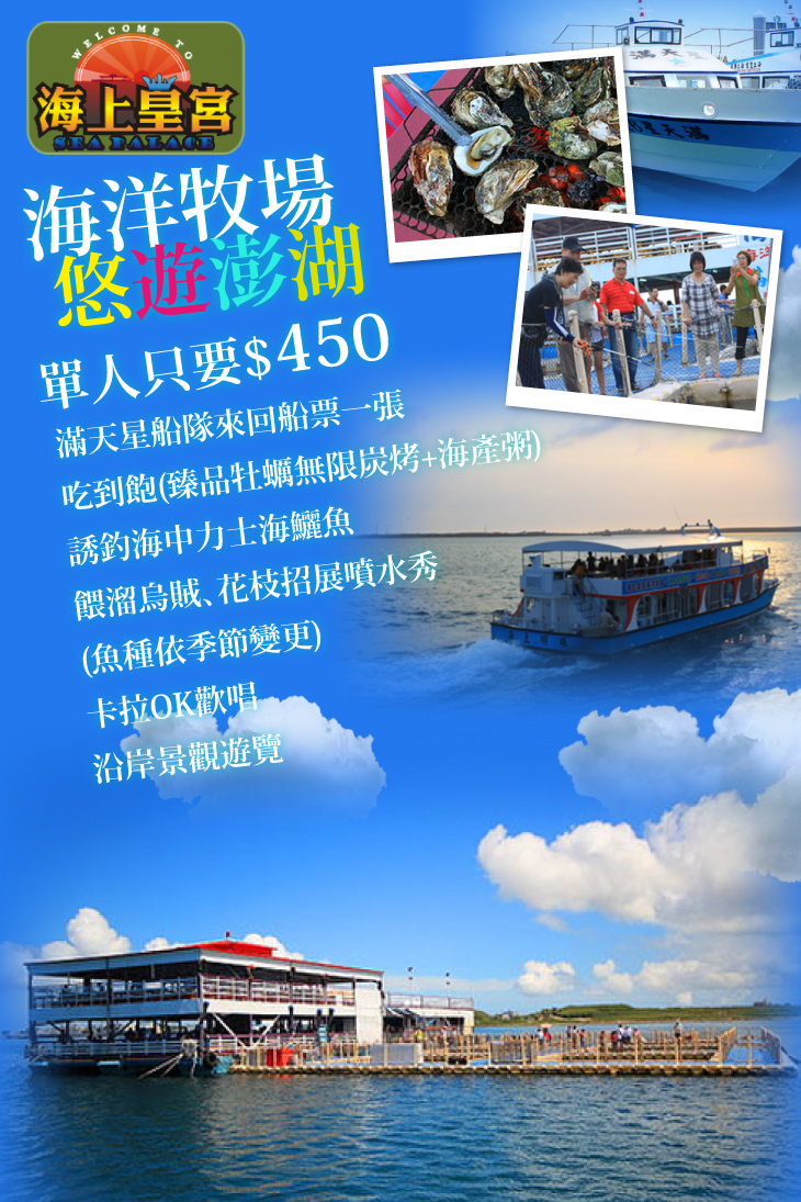 想到澎湖,腦海中還停留在只有吉貝嶼、雙心石滬等地方能玩耍嗎?今年麻吉多了一樣玩樂選擇─【海上皇宮海洋牧場】!澎湖最大海上休閒活動平台,活動空間安全、舒適、寬敞,同時間可容納250人的海洋休閒平台,平台上除了炭烤牡蠣、釣海鱺魚、夜釣小管,還能餵食其他魚群、遠挑欣賞澎湖美景唷!現在推出悠遊澎湖超值方案!
