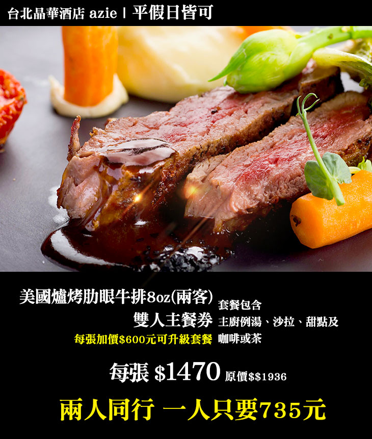[即期優惠餐券]2022/7/15到期,(單張即出貨)美國爐烤肋眼牛排8oz雙人主餐券(每張加價$600元可升級套餐)(平假日皆可使用)