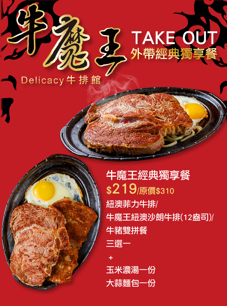 牛魔王經典獨享餐〈紐澳菲力牛排/牛魔王紐澳沙朗牛排(12盎司)/牛豬雙拼餐 三選一 + 玉米濃湯一份 + 大蒜麵包一份〉