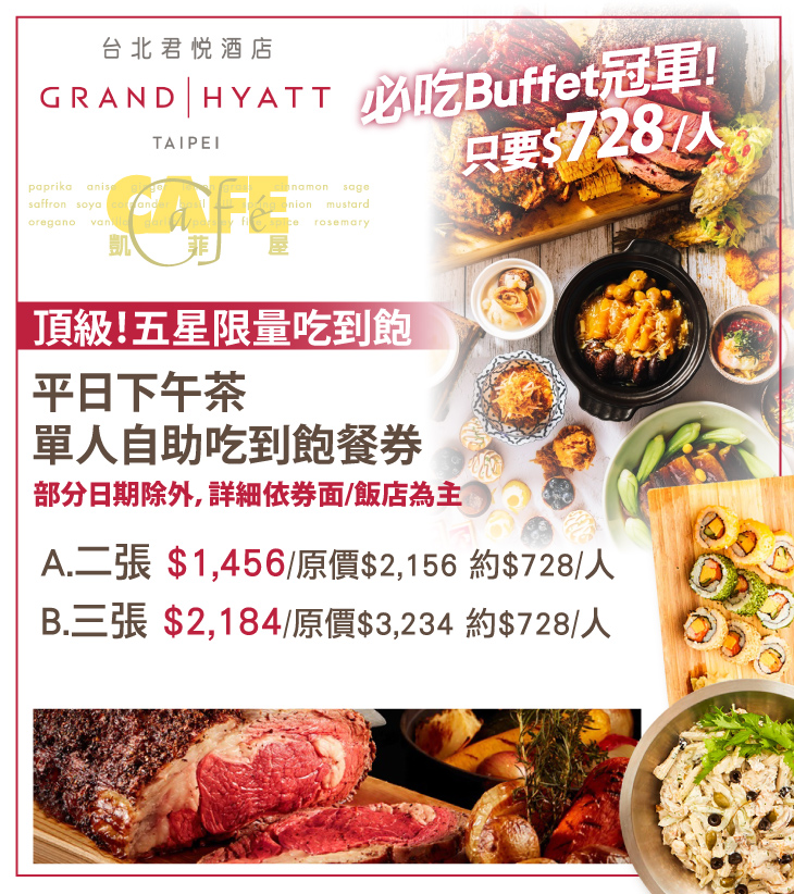 2015年風光完成改裝的台北君悅酒店凱菲屋,不僅是現今五星級飯店自助餐廳霸主,連年在網路評比奪下「飯店人氣王」與「最佳人氣美食王」等雙料冠軍肯定,舒適寬敞的用餐環境,擁有大片落地窗、現做餐點、礦泉水則選用法國Evian頂級品牌回饋顧客,酒店亦網羅前漂亮中餐廳主廚胡政裕擔任美味料理掌舵手,掌管整體菜色呈現,將各式菜色升級成Fine Dining等級,同時中式餐檯也有資深中菜主廚,十餘種頂級法式甜點以店中店的概念,讓饕家能至此品嘗最精緻豪華自助饗宴!