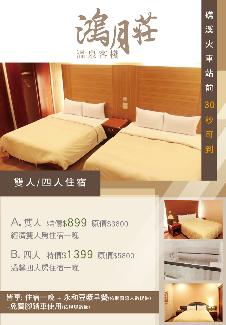 位於宜蘭礁溪溫泉區內礁溪火車站附近,一出車站就可到達,是您搭火車前往礁溪溫泉住宿的優先選擇,交通十分便利,可以盡情體驗礁溪自然風情~客棧風格溫馨高雅,提供精緻舒適的獨立套房,讓您與另一半可以在獨立私人的空間內享受專屬兩人的甜蜜時光♥而現在,宜蘭礁溪的【鴻月莊溫泉客棧】與夠麻吉再度攜手合作推出獨家的超省方案,不但附贈永和豆漿的早餐,還免費租借腳踏車,任顧客盡情使用~別猶豫了,趕快帶著您的另一半或是好朋友,一起來趟說走就走的輕旅行吧✿✿✿