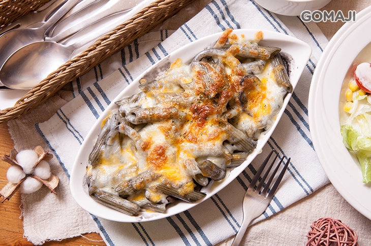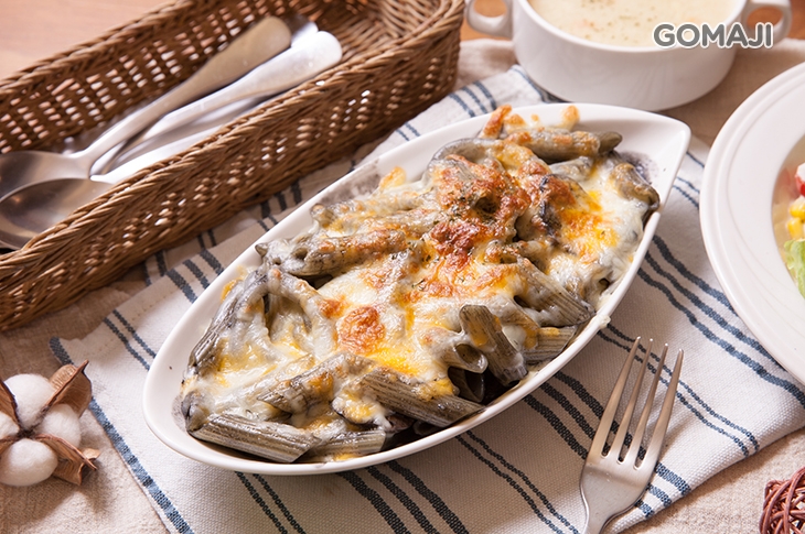 看看那色彩鮮豔層次分明的墨魚通心麵,撒上香氣逼人的起司;緊接著送進烤爐慢慢焗烤,起司經過焗烤後的香氣實在誘人,金黃色澤搭配上墨魚通心麵,視覺上超滿足!牽絲的起司有誰能抗拒?