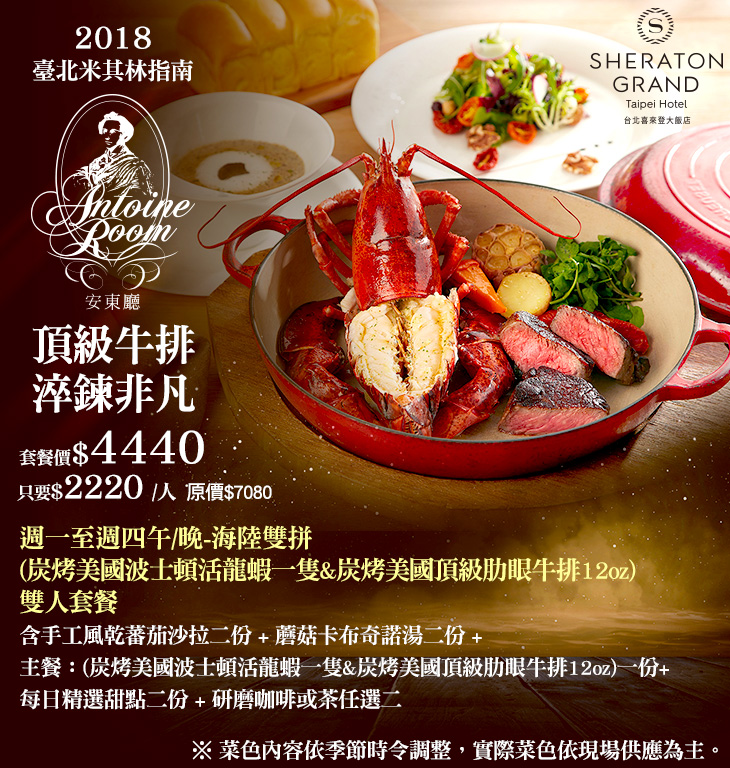 ★ 限量!臺北米其林指南推薦,週一至週四午/晚-海陸雙拼(炭烤美國波士頓活龍蝦一隻&炭烤美國頂級肋眼牛排12oz)雙人套餐