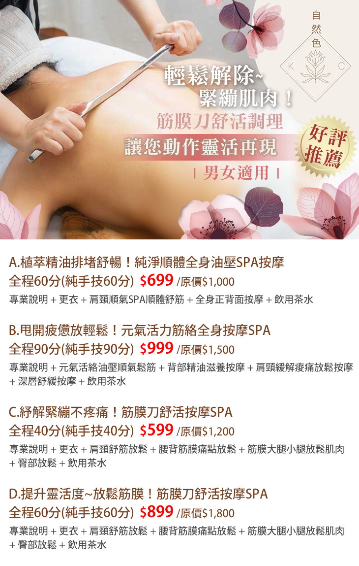 A.植萃精油排堵舒暢!純淨順體全身油壓SPA按摩全程60分(純手技60分) / B.甩開疲憊放輕鬆!元氣活力筋絡全身按摩SPA全程90分(純手技90分) / C.紓解緊繃不疼痛!筋膜刀舒活按摩SPA全程40分(純手技40分) / D.提升靈活度~放鬆筋膜!筋膜刀舒活按摩SPA全程60分(純手技60分)