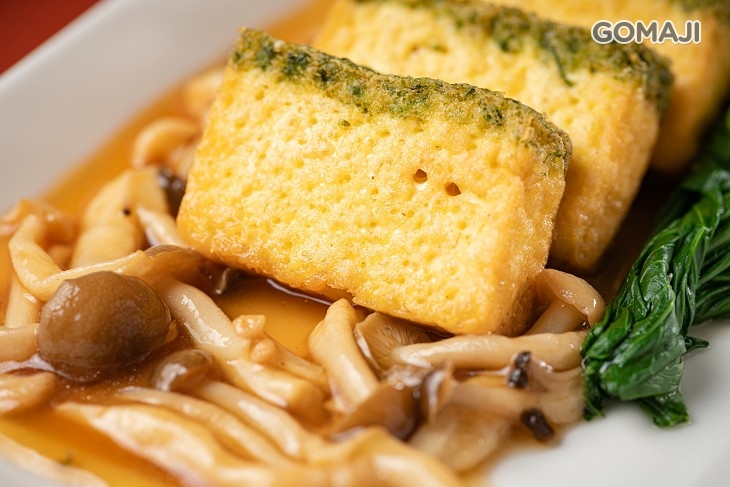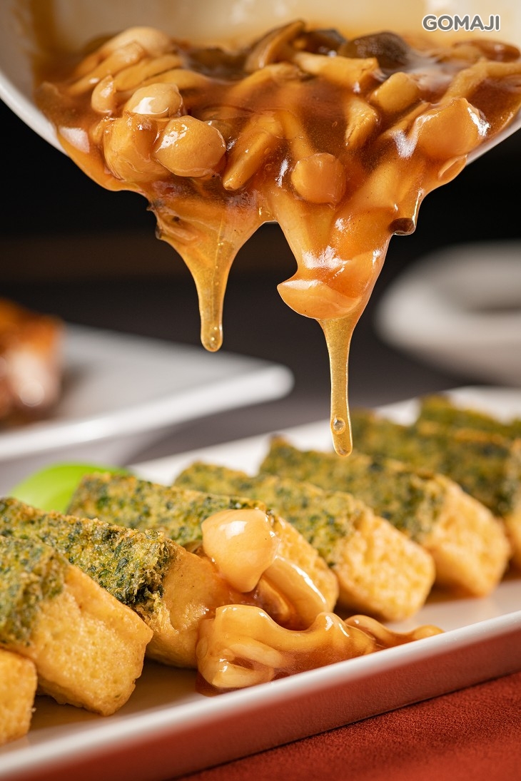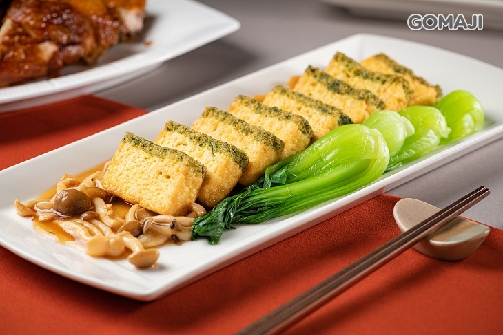 「翡翠手工豆腐燴菇」是一道豐富蔬食美餚,經過3道手續蒸煮,出品前炸豆腐上澆淋了用老抽、生抽與蠔油,香炸豆腐表層並塗敷了一層用鹹香的芥蘭菜蓉,再加入綜合菌菇,成為一道營業美味兼具蔬食料理。
