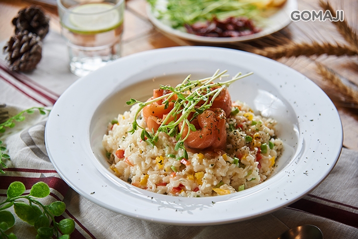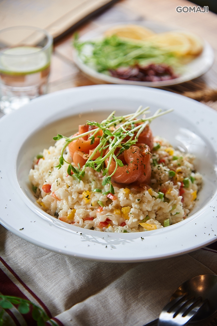 粒粒分明的Q彈米飯,佐入色澤繽紛的蔬菜,以及香濃馥郁的白醬,文火細燉成一道溫潤滑嫩的燻鮭魚燉飯。粉橘色的燻鮭魚在燈光下透映著閃閃油光,一放入口中便在味蕾化成豐盈的鮮甜,風味絕佳,配上燉飯一同品嚐,恰好也為整體添抹了一分清爽的鹹,使口味層次更加豐富,這精緻、美味的燻鮭魚燉飯,您一定要品嚐看看!