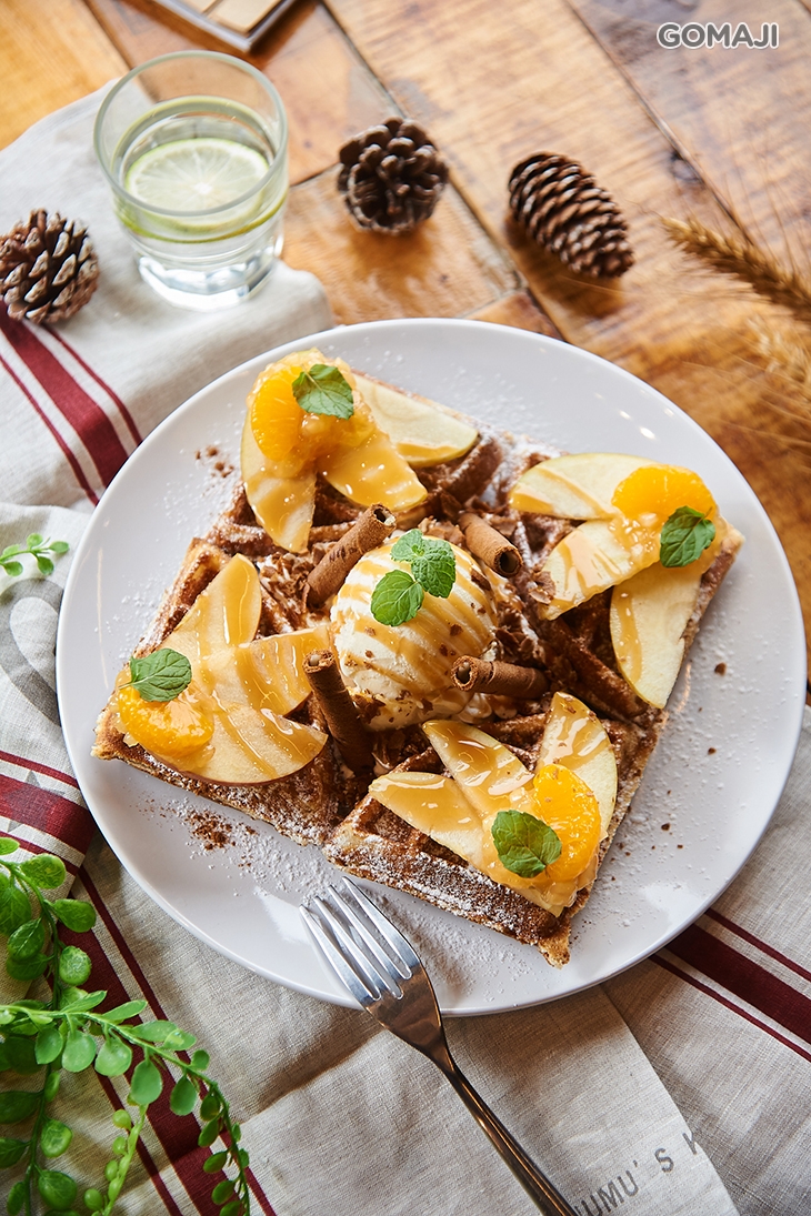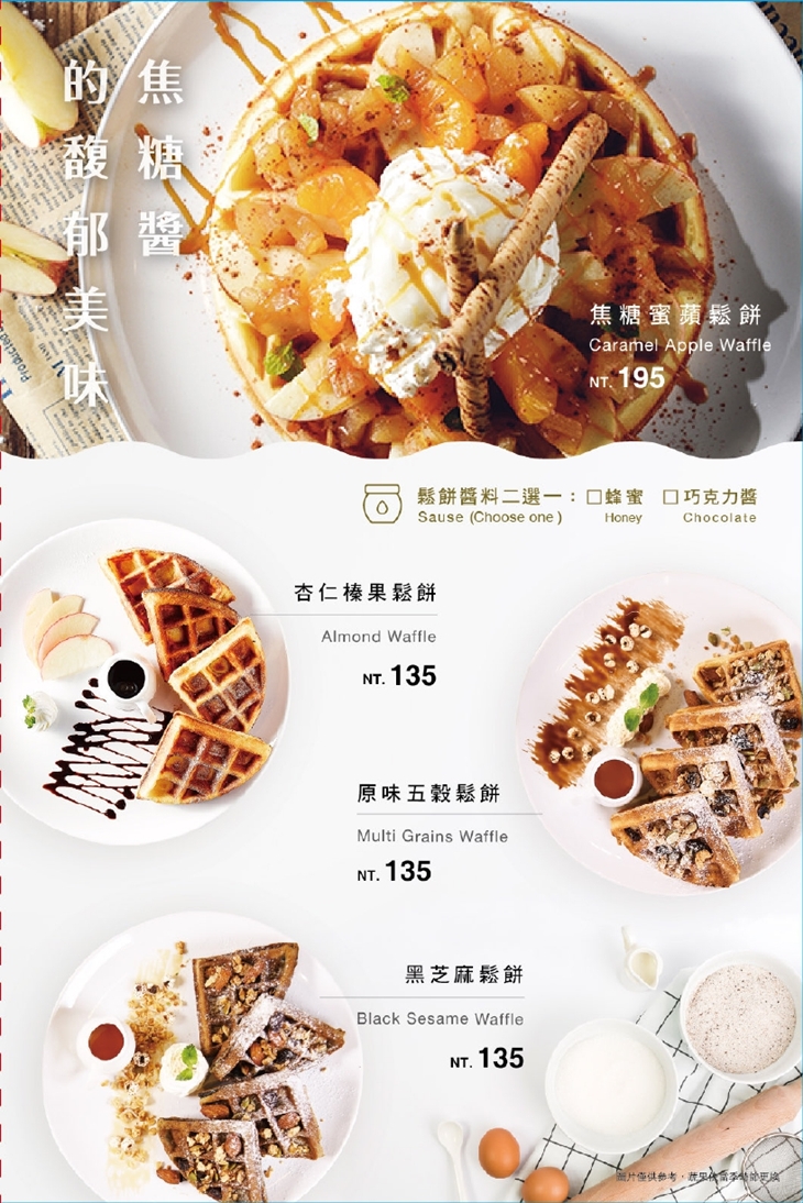 外層酥脆、內裡鬆軟綿密的酥香鬆餅,淋上滿滿琥珀色的焦糖,再佐上店家私房醃製的蜜蘋果與氣味獨特迷人的肉桂,這香甜可口的焦糖蜜蘋果肉桂鬆餅模樣豐盛,卻不失精緻,細細咀嚼,焦糖特有的焦甜香氣和鬆餅輕甜不膩的滋味完美契合,而蜜蘋果恰好增添了些許果香,肉桂則負責了後味,為整體點綴了令人不斷回味的香韻,實在讓人著迷不已~