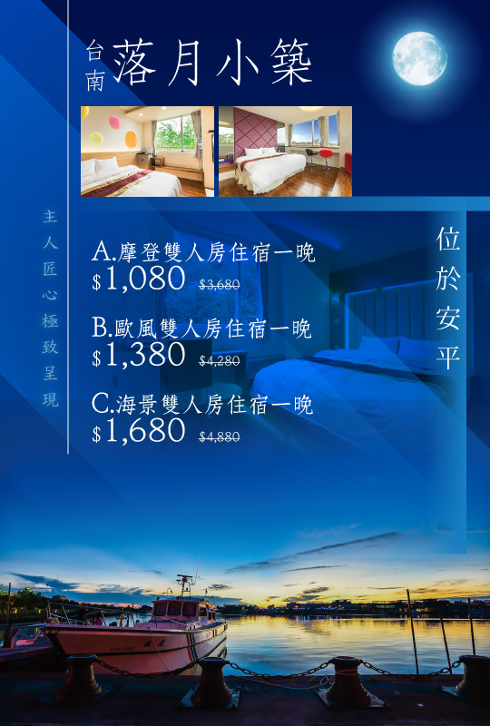 座落在台南市安平區的落月小築,白天和晚上都有不同的美,而且越夜越美麗,落月的海景房清晨或夕陽時分都能展現不同的風情, 一眼將林默娘公園&運河海景盡收眼底。
