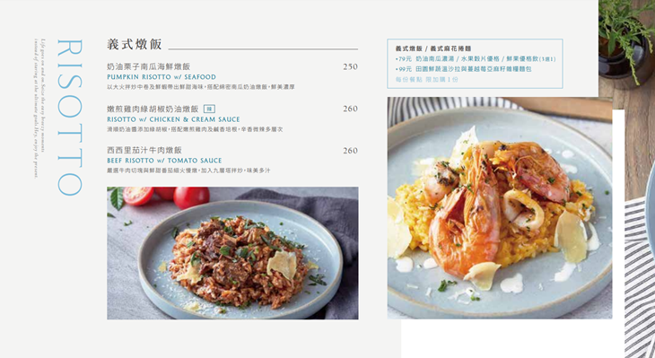 以大火拌炒中卷及鮮蝦帶出鮮甜海味,搭配綿密南瓜奶油燉飯,鮮美濃厚。