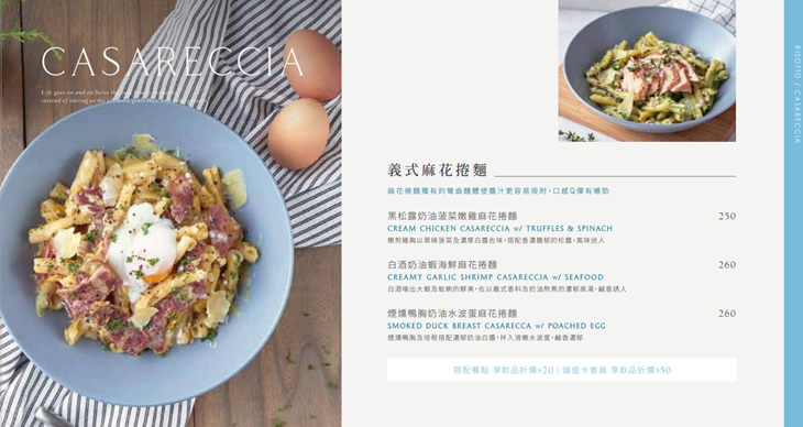 煙燻鴨胸及培根搭配濃郁奶油白醬,拌入滑嫩水波蛋,鹹香濃郁。