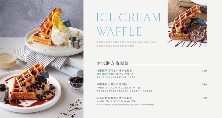 採用新鮮雞蛋及香醇牛乳製作而成的鬆餅,烘烤後散發微微的奶香,搭配濃郁巧克力冰淇淋和榛果可可醬,口感濃滑。