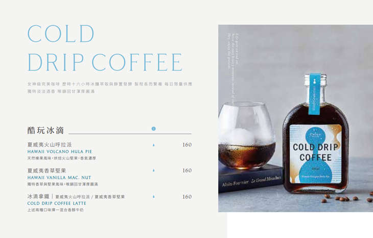 女神級完美咖啡!歷時十六小時冰釀萃取與靜置發酵,製程長而繁複,每日限量供應,獨特淡淡酒香,喉韻回甘渾厚圓滿。