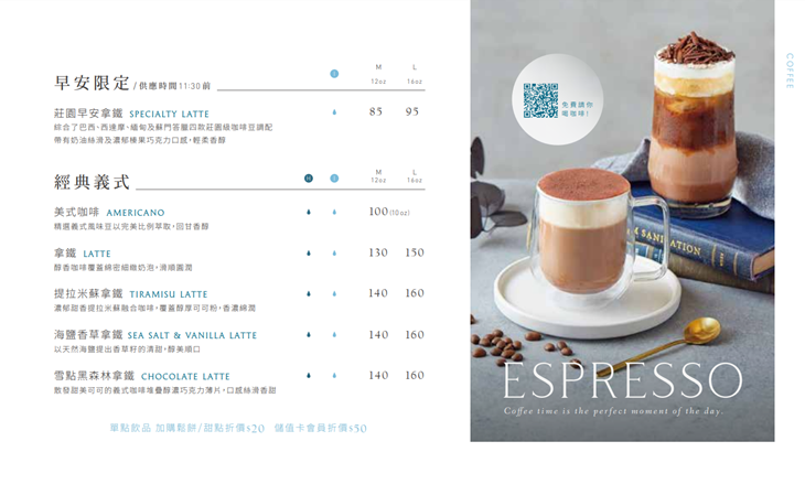 雪點黑森林拿鐵:散發甜美可可的義式咖啡堆疊醇濃巧克力薄片,口感絲滑香甜。